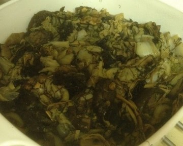 8. 然后放进绍菜,方法是先放一两把,翻炒至缩小后再放一两把,直到所有绍菜都放进锅里