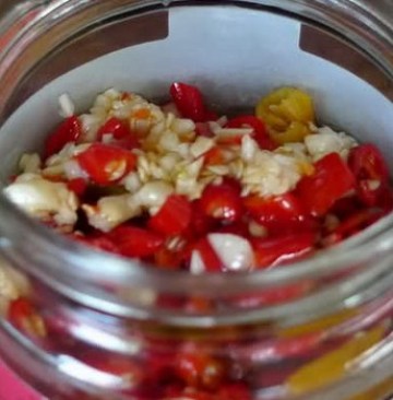 4、蒜头和辣椒充分剁碎之后,放入辅料,搅拌均匀,装瓶即可,也可室温存放。