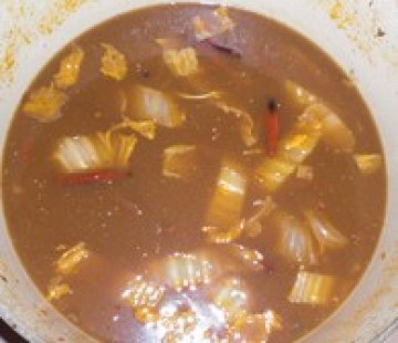 4.续放入牛高汤煮滚后,加入所有调味料待再度煮滚。