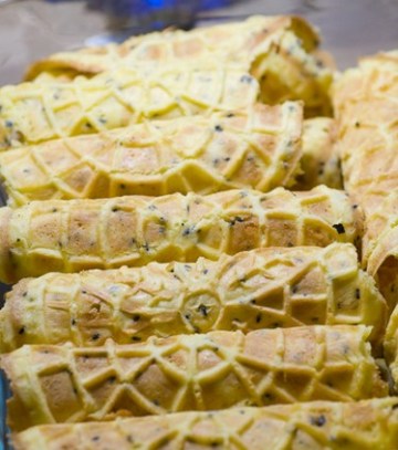 4、模具先两面都用小火预热下,打开,兜一大勺面糊放置于模具中间或者中间偏上的位置;这模具是专门做pizzelles的,没有的可以用平底锅,但效果会有区别。 5、盖上模具,转动下,让面糊均匀的铺满模具。用小火加热一分钟后翻面,再加热一分钟;