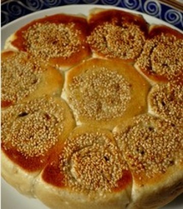 3、在烤盘上摸上一层油。在卷的边上切一块,在切面沾上生的白芝麻,放在烤盘中间,然后在把剩下的卷均匀地切成8块,放进烤盘,用锡箔纸封住。这样的作用是在烤箱里面团不会流失水分,达到即蒸有烤的双重效果。在室温下第二次发酵30-45分钟。