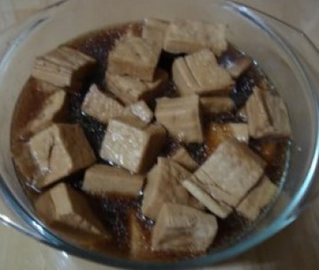3、盖好纱布,压上重物。约半小时,一块硬豆腐就形成了。