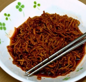 干萝卜条200克,韩国干辣椒粉(要粗的),独头蒜4枚捣碎,姜1大块切碎,好吃味浓的不太咸的酱油500毫升,白糖200克,味精少许