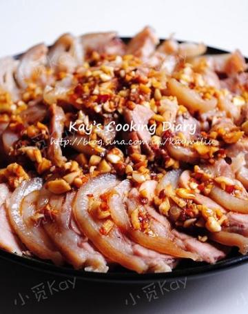 3、用蒜末、酱油、香醋、辣椒油调成蒜香汁,浇在肘片上即可。