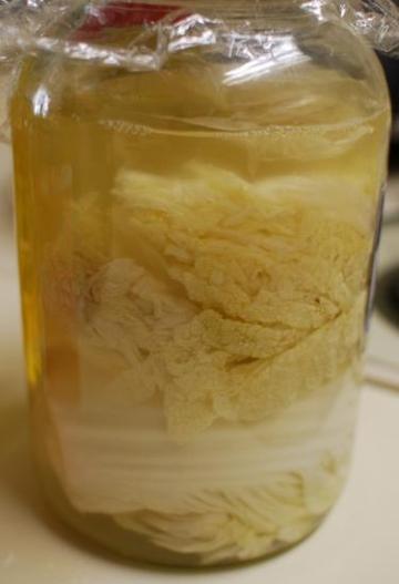 1: 大白菜洗净劈成4瓣,放入较大器皿里,倒入放凉至大于80度的热水,满过所有材料,放24小时以上(夏天要放入冰箱,冬天适当延长发酵时间,根据当地温度来定);