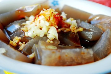 5.彻底凝固之后就可以取出食用了,一般2-3个小时就可以凝固了,也可以放置一个晚上,第二天再食用,吃的时候,将醋,生抽,蒜末,香油拌匀成味汁蘸食。