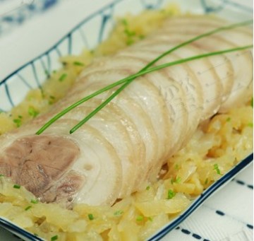5)猪踭继续泡在汁水里,凉后入冰箱冷藏5-6小时后取出,拆除棉线和纱布后切片。吃时蘸食白醋。