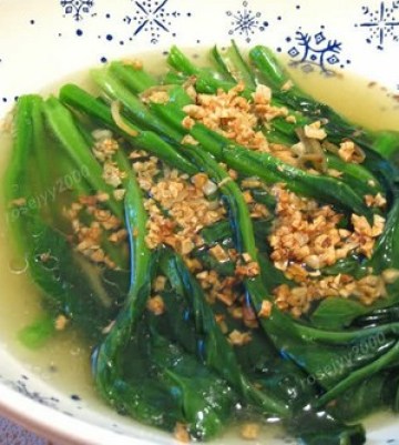 2、然后重起锅放油,油热放蒜茸和少许姜茸,炸至半焦,连油连蒜茸姜茸倒在菜面上即可。