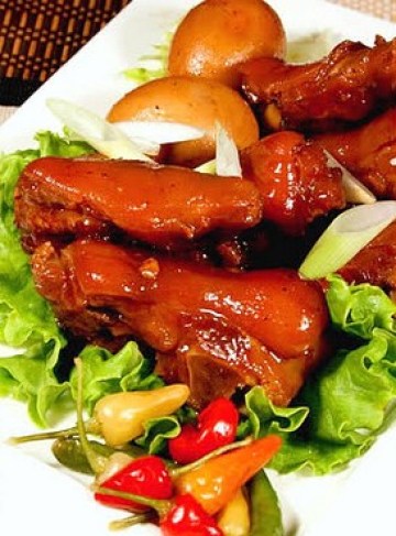 6.待作法5的猪脚浸泡一天后,等到要食用时取出猪脚切薄片,沾酱食用。