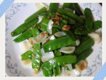 4、 锅中油热后,放入蒜片炒香,放入荷兰豆翻炒变色;