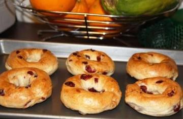 方法一:酵母头配料搅拌均匀加盖放置16个小时候和面团的材料混合好揉大概10分钟左右至光滑。贝果不讲究揉面出筋,只要揉匀即可。然后放盆中加保鲜膜发酵至体积两倍大,室温的话一个小时到两个小时不等。此时就可以大锅中烧水加入少许的麦芽糖待用。(可用白糖代替)。等面团发酵好了,排气,在加入蔓越莓干或者核桃仁(只要和到面团你就可以了)在将面团分成均匀的几等份。然后将每一份整形成圆环状,有两种方法。简单的就是将面团中间捅个洞,老美比较懒大部分方子里都是这么弄的。这次我就这么弄的,这样整形的效果就是中间的洞会堵得比较死,如果用下面的整形就会洞比较大。还有麻烦点的就是擀成长面片然后卷起来成个长棒,两头对接上。对接处一端擀平,另外一端包进去。一定喷些水否则包不好。整形好了,就立即将其放进沸腾的水中过水浴了。先头朝下放进去大概50秒后用漏勺翻面再50秒就可出锅。出锅后刷上蛋白液然后撒上topping就可以进入烤箱了。烤箱预热425度,放入贝果大概25分钟待表面金黄就可出炉。