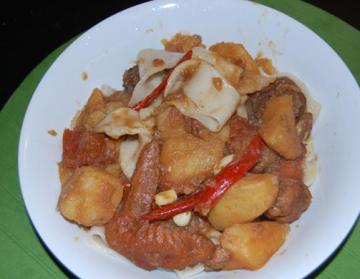 新疆大盘鸡其实还要放菜椒和另处一种圆的辣椒。我没有。