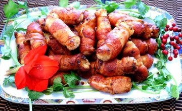 2、马蹄粒加盐、糖、味精、生粉拌匀搓成長园筒型,用培根条卷好,再用虾膠封口,中火微煎至酥脆捞起,滤干油,擺盘即可出菜。沾苏梅酱吃。