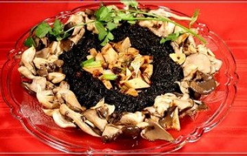4、大火热油锅,下蒜茸、姜片爆成金黃后,下蚝油爆香,再放发菜、料酒与鲍鱼、水,转小火煨十五分钟后,捞起沥干水,倒在蚝菇盘中摆成圆形圈。