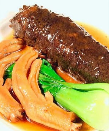 做法:烧热锅下油热后,放姜,葱爆香,再放海參大火爆,赞酒,注入適量清水,滾煨片刻(此道手续主要是除去腥味),再過冷河後取出瀝干備用.鸭掌先过滚水烫一烫,捞出沥干再用些少老抽上色拌匀,再抹干放入沸油内炸成金黄色备用.再热油锅,爆香姜,葱与蚝油,再放鸭掌爆炒,赞酒,注入适量高汤,滚后即转为小火蓋蓋煨大约一小时鸭掌己经糯软后,此时即可放盐,糖,味精等调味然后放入海参转中火煀大约二十分钟滚至收汁即可上碟出菜。