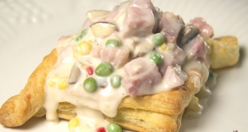 5,如果时间算得好的话,这个时候丹麦酥应该刚刚出炉,非常香酥.把做好的a la king堆在上面.呵呵,我老公吃起来可就没停了:)