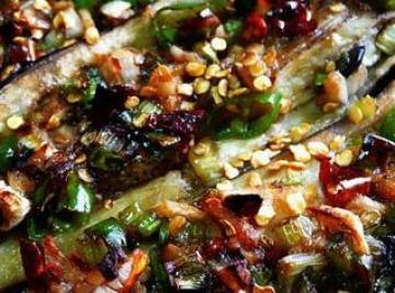4、将茄子扒开,将肉末、蒜泥、姜蓉、盐、糖、鸡精、生抽、油、少许水拌均匀抹进茄子里即成。