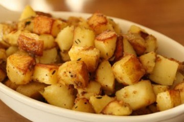 6.锅烧热后放入少许色拉油,油热后放入做法5的土豆,用小火煎至金黄色后捞出即可。食用时可搭配沙拉酱,也可在沙拉酱中放些火腿丁和酸黄瓜丁来增加味道。