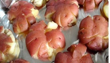 3、土豆稍凉温热时,把小土豆放在案板上,先在每一个土豆的周围用刀划上几条细口子,再用一块儿干净的 餐巾,盖在小土豆的身上,一个一个的用手心把小土豆压扁,一朵朵小梅花就绽放了。