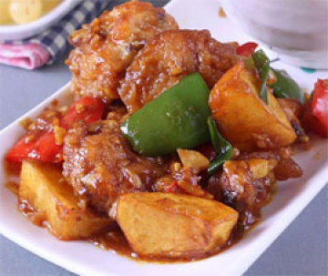 11、倒入炸好的土豆鸡翅翻炒到都裹上芡汁即可关火