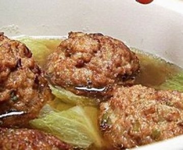 4、炖丸子的原汤先烫一些青菜,荤素搭配嘛!再将剩下的原汤烧沸后用湿淀粉勾芡浇在丸子上即成。