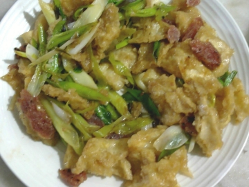 鱼膘(浸软切块)3条 腊肠片 2条 蒜苗段 3-4根 蒜末1大匙 蚝油 2匙 麻油 随意 盐 适量 水 少许