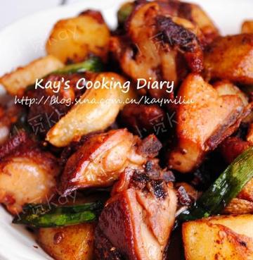 5、把鸡腿块再次倒入锅中与土豆一起翻炒片刻,喜欢辣的再加一点干红椒粉,起锅前加入剩下的青葱段炒一会儿
