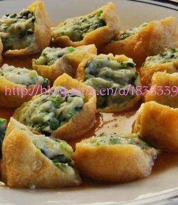 1 将龙利于打成鱼茸,菜薹切小丁,油豆腐斜切半取出内心备用