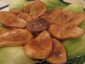 4、青菜焯过水,围绕碟子边摆一圈。把炒好的杏鲍菇摆在上面。