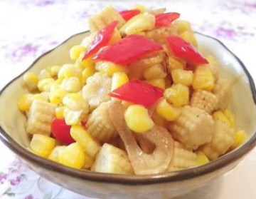 三、锅热放油,放少许葱粒或蒜茸,爆香倒入玉米、玉米芯和辣椒块,兜匀,放盐、胡椒面和几滴料酒,翻炒几下可出锅。