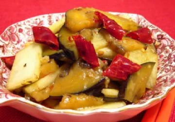 二、倒入西瓜皮和茄子,改大火爆炒,点族精盐和少许白糖,喷一点料酒,炒到茄瓜断生即可起锅。