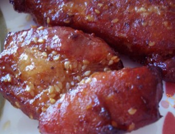 1.烤箱预热8--10分钟,临烤时沫一层用麦芽糖、水和两三滴柠檬汁兑成的汁,上钩,挂在烤箱最顶层,375--400f,30--40分钟,中途最好再沫一层汁,再就grill功能300f、中档烤5--8分钟,一定要打开箱灯,随时观察。
