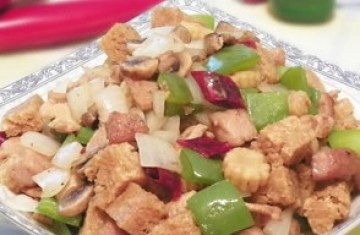 一、将罐头玉米芯切成粒,蘑菇切成四瓣,鸡肉、猪肉用生抽、老抽、糖、酒、胡椒面腌渍,手抓至起胶,再放玉米水淀粉抓均匀,辣椒切成段,豆腐切成粒,菜椒和洋葱切成小块。
