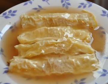 2、取一张豆腐皮,在水里稍稍浸一下,然后把肉馅和金针菇包好,伤锅蒸15分钟,再用美极鲜和淀粉调一个芡汁浇上就好。