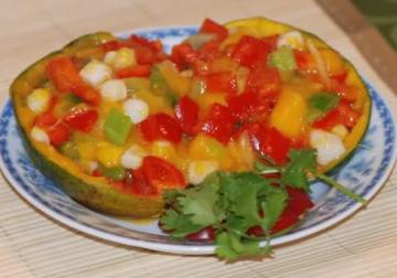 即可装入芒果皮做好的果皮盏中,装盘上桌.