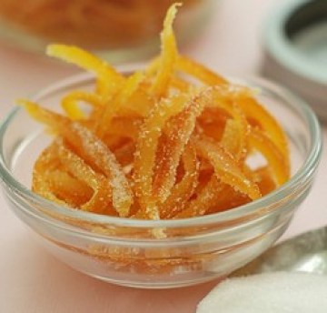 3.做糖浆:小锅内加水和糖混合,小火煮到华氏230-234 f(摄氏)下橙子皮,把火开到最小慢炖30分钟。放到架子上晾干,滚糖。