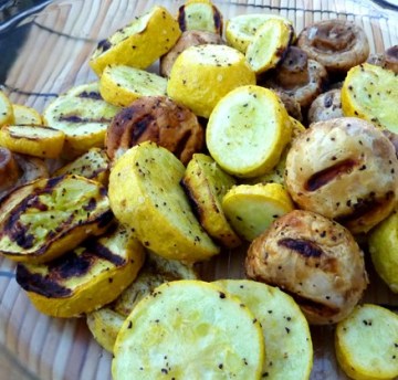 1、把蘑菇和夏南瓜洗净,放一大zip bag或大盆里,加柠檬胡椒粉、少许盐、橄榄油,拌匀。