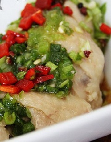 6.凉透的鸡斩段儿,上面均匀抹上薄盐,抹上葱椒碎,鲜辣椒切碎铺在表面