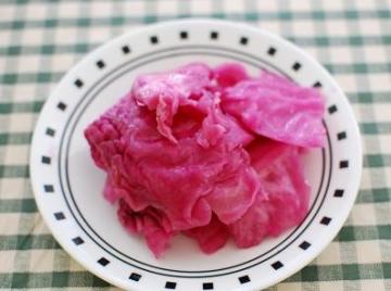 紫色的圆白菜掰成片,撒上盐,拌匀,放置两个小时左右,目的是杀出点水分,容器中放入适量的水,糖,白醋,再把菜放进容器,第二天就能吃了。(注意糖要溶解,需要的话煮一下糖水)口感酸甜,很脆,颜色也很漂亮~夏天吃很爽口,也不用担心热量。比例大约是:糖1:白醋2:水50