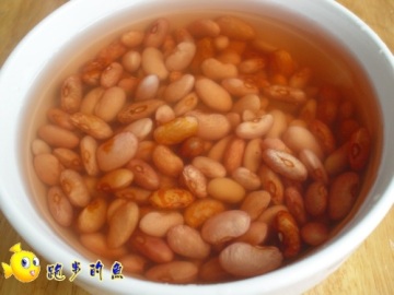 1. 把红豆洗净后,加1/4茶匙的盐, 用1500g水在锅内浸泡1小时左右。
