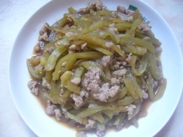 3.锅中油热后,放入挤干的西瓜皮进行翻炒,然后加入肉丝、盐、生抽和糖,继续翻炒,大火炒5分钟即可。