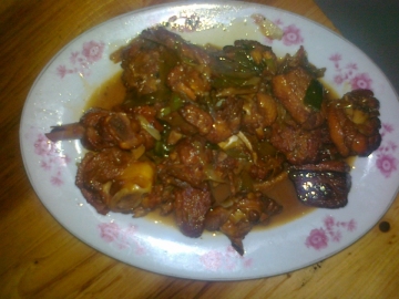 3、倒入鸭块翻炒。调入生抽,老抽,少许白糖炒匀。(这一步就一直炒到你觉得再不加水就不行了为止)
