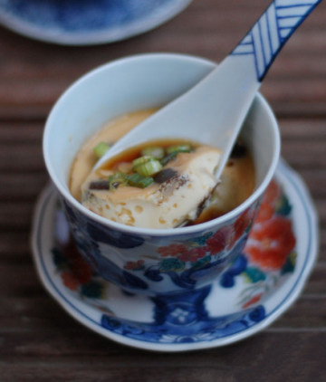 (2)(1)料用滤网滤过,将香菇切丁,加入滤过的蛋汁,放入锅中蒸10分钟后取出。