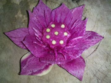 心里美萝卜一分为二,底部削平,用雕刻刀均匀分为六瓣,用刀尖画出荷花半的样子,薄薄片出第一层花瓣,然后去废料,片第二层花瓣,再去废料,用v型戳刀戳出花蕊,然后再用u型戳刀挖出废料,把绿色萝卜皮做成莲子,塞到挖好的小洞里,就大功告成了,