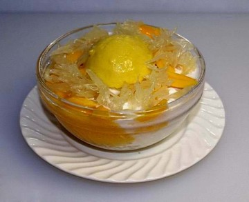 先把西米煮透置底,加入椰汁至5分满,搅拌均匀。用两个芒果搅酱,接下来用炒冰机加入芒果牛奶,奶油5z炒至凝固,取出切块。白凉粉10克,水35z煮好至凉成固体,加入一个芒果与同等分量的白凉粉与果糖搅成酱。 酱汁与芒果冰至第二层,在一芒果切块与西柚放置第三层,最后用打球器挖一个冰激凌球置顶, 在然后就......开动啦~~~~