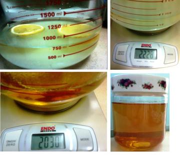 2. 把全部材料放进一个大锅内, 秤出重量。这里重量是材料水加糖= 3500g, 柠檬重量120g,锅子重量1250g,总重量=4870g)