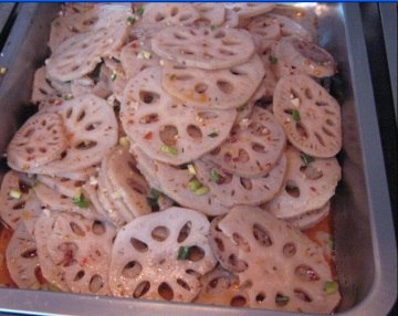 将藕片置于清水中浸泡,每10kg清水中加于100g食盐,浸泡时间为30分钟左右,浸泡完毕后捞取沥干。