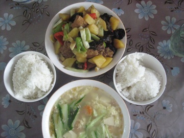 排骨炖土豆、芸豆;海米、豆腐蛋花汤;白米饭