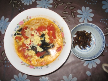 西红柿蛋花面条;小咸菜