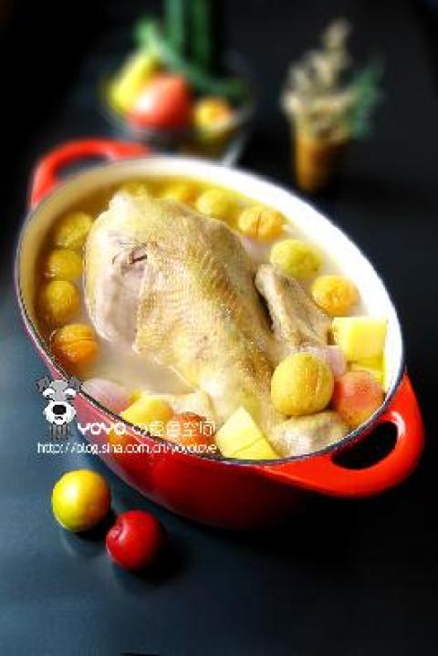 笨鸡3000克,李子1000克,洋葱400克,土豆200克,姜5片,黄酒40克,八瓣1/2个,盐10克